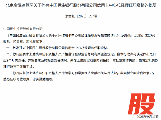 9月19日金融一线消息,北京金融监管局发布批复称,核准孙兴中国民生银行股份有限公司信用卡中心总经理的任职资格。