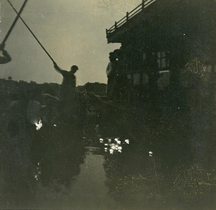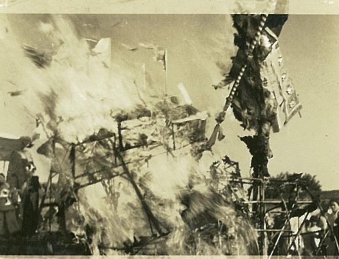 烧法船是中元节的保留项目,法船系大型冥器(纸活,亦称烧活),小者一米多,大者十几米。由冥衣铺匠人用秫秸扎架,以彩纸裱糊而成。船头为猛虎图案,船的桅杆上挂一面旗子,正面写:“盂兰圣会”,背面则写“慈航普度”,还要糊掌舵人和划船人。图为北海公园烧法船。