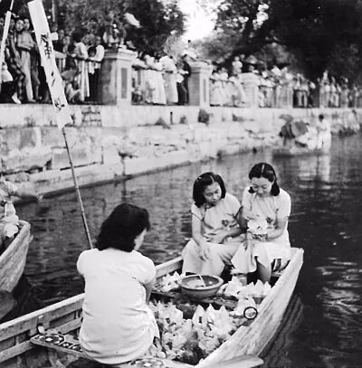 中元节放河灯,成了上元灯节之后的又一燃灯的节日,百盏千盏河灯拥入水面上,随风逐波,时聚时散,宛如银河繁星跃动于水面,又似荷花朵朵竞相开放。图为几名姑娘在北海公园放河灯。