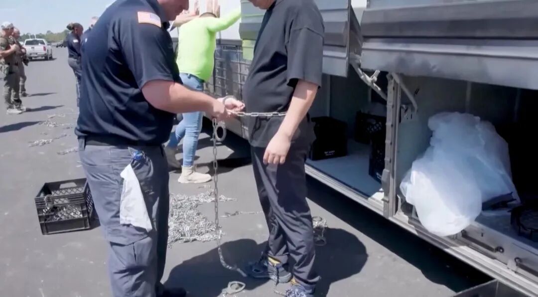但即便是非法移民,毕竟不是恐怖分子,这样上脚铐手铐腰链子,打的是谁的脸?