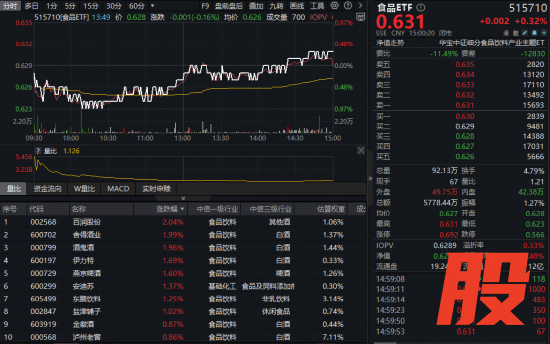 吃喝板块今日(9月19日)下探回升,反映吃喝板块整体走势的食品ETF(515710)早盘场内价格一度跌近1%,午后拉升翻红,截至收盘,场内价格涨0.32%,终结日线五连阴。